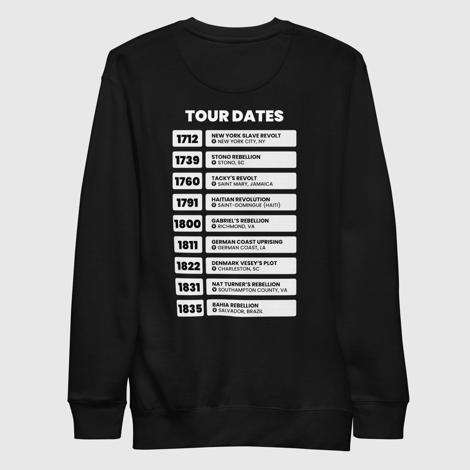 Each tee is designed like a world tour of Black resistance — featuring “Fight Black, King!” or “Fight Black, Queen!” across the front, and a timeline of real slave rebellions printed on the back like legendary tour dates. From the Stono Rebellion (1739) to the Haitian Revolution (1791) to Nat Turner’s Rebellion (1831), every name, date, and city tells a story of defiance and liberation.