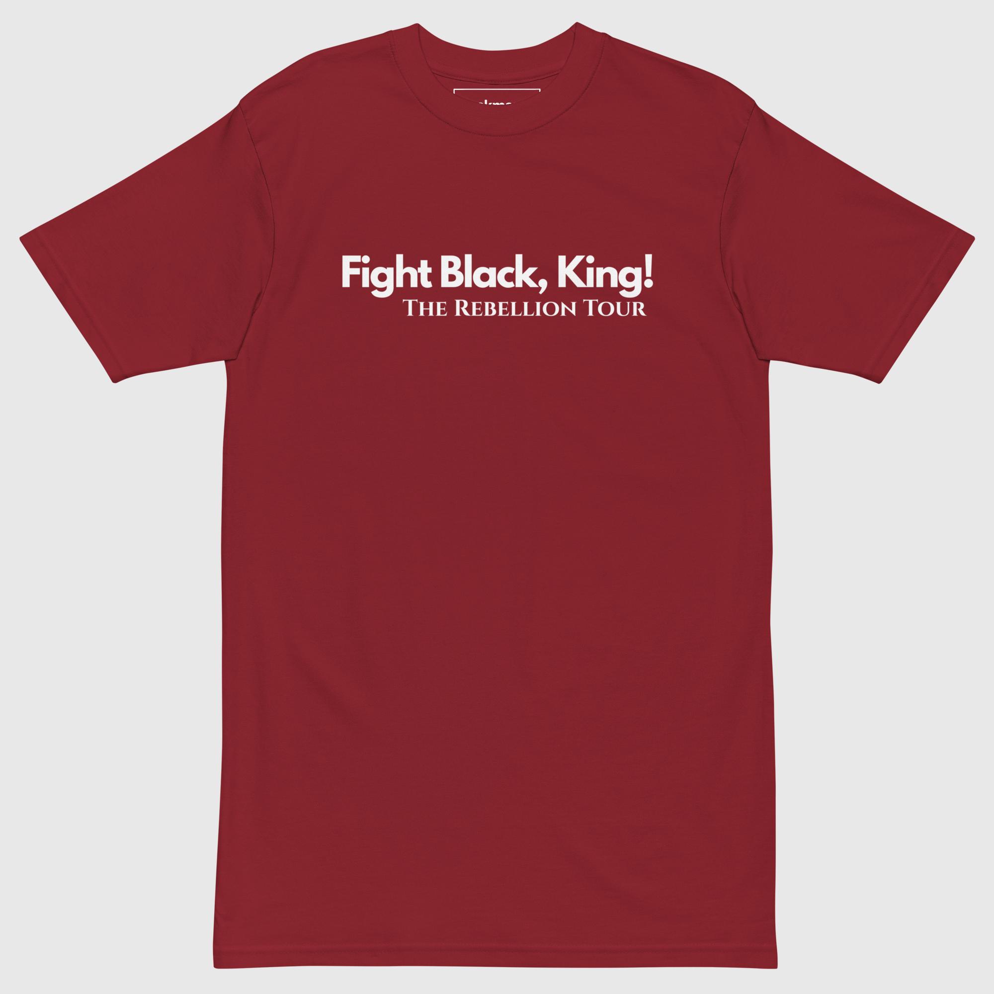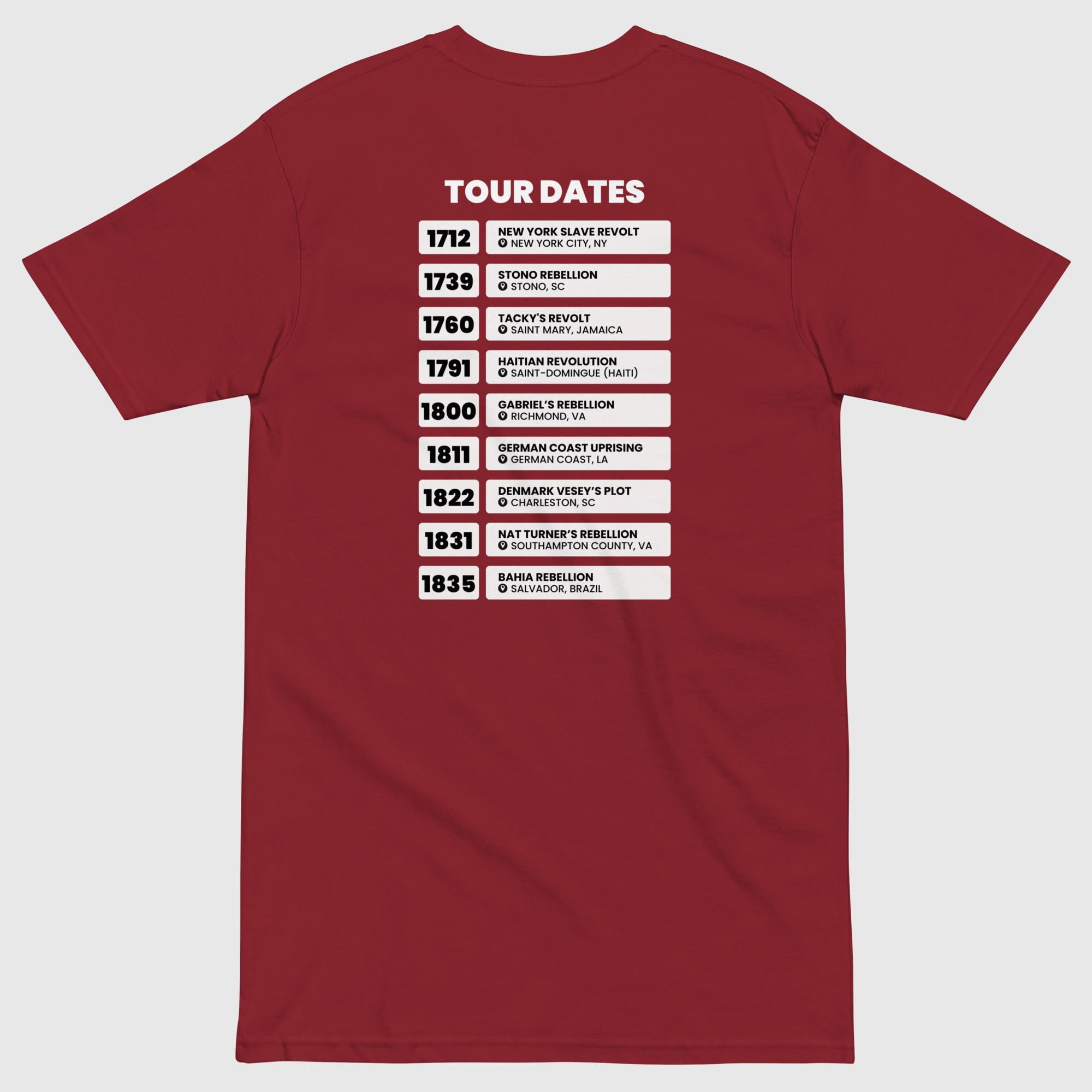 Each tee is designed like a world tour of Black resistance — featuring “Fight Black, King!” or “Fight Black, Queen!” across the front, and a timeline of real slave rebellions printed on the back like legendary tour dates. From the Stono Rebellion (1739) to the Haitian Revolution (1791) to Nat Turner’s Rebellion (1831), every name, date, and city tells a story of defiance and liberation.